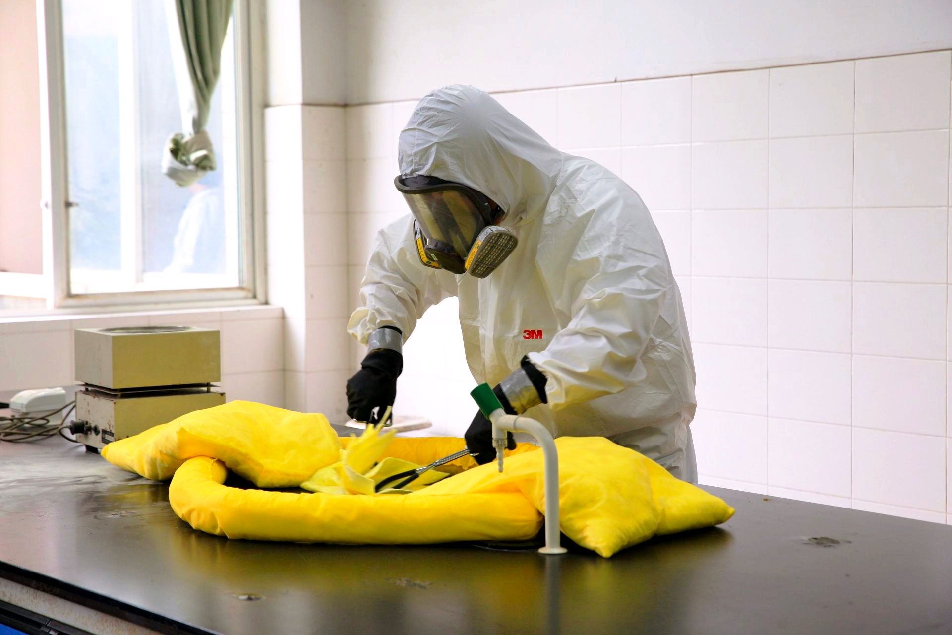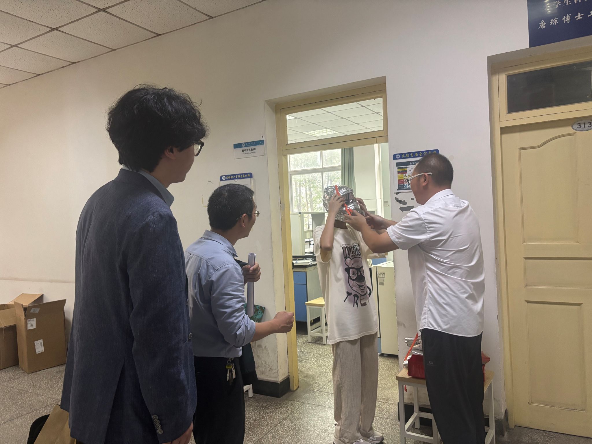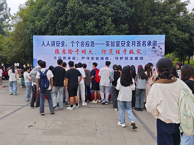 培训结束后,参训师生到行知楼外参与了实验室安全签名承诺活动,进一步强化安全从我做起的意识。接着,参与及观摩应急演练内容的相关师生们来到化生实验楼3楼继续开展油浴锅燃烧应急演练活动。本次演练模拟场景为实验室发生油浴锅燃烧后,实验人员迅速启动应急预案,有序执行人员自救、警戒隔离、事故上报、应急决策、安全处置、应急恢复及整改落实等一系列规范操作。演练由我校7名研一新生、材化学院、信实处相关老师联合实施,相关参训师生在场观摩了演练全过程。演习结束后,现场观摩的同学们也在教师指导下亲自尝试了防烟面具等的穿戴过程。