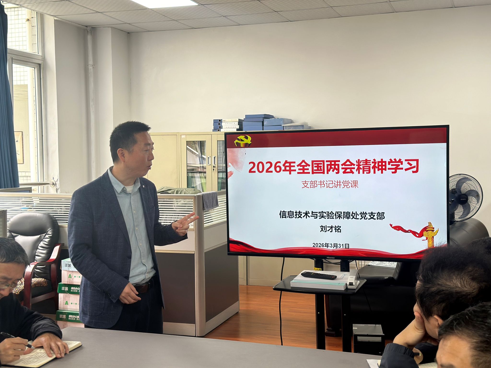 3月31日,信息技术与实验保障处党支部召开支部党员大会,支部书记刘才铭同志以“2026年全国两会精神学习”为题讲授专题党课。支部全体党员同志参加。