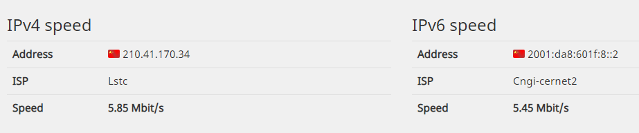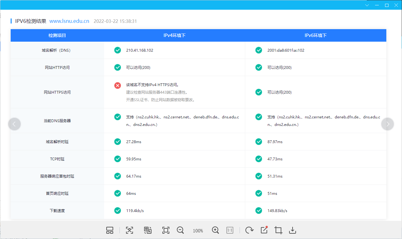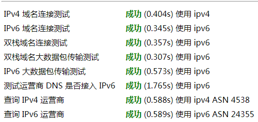 (附图为校园网IPv6域名、IPv6连通性和到IPv6国际主站的速度测试结果截图)